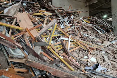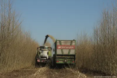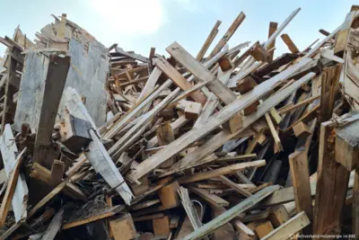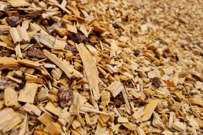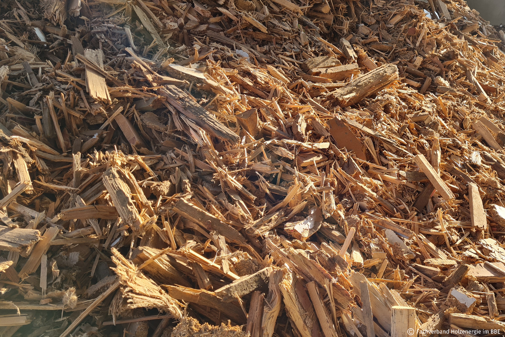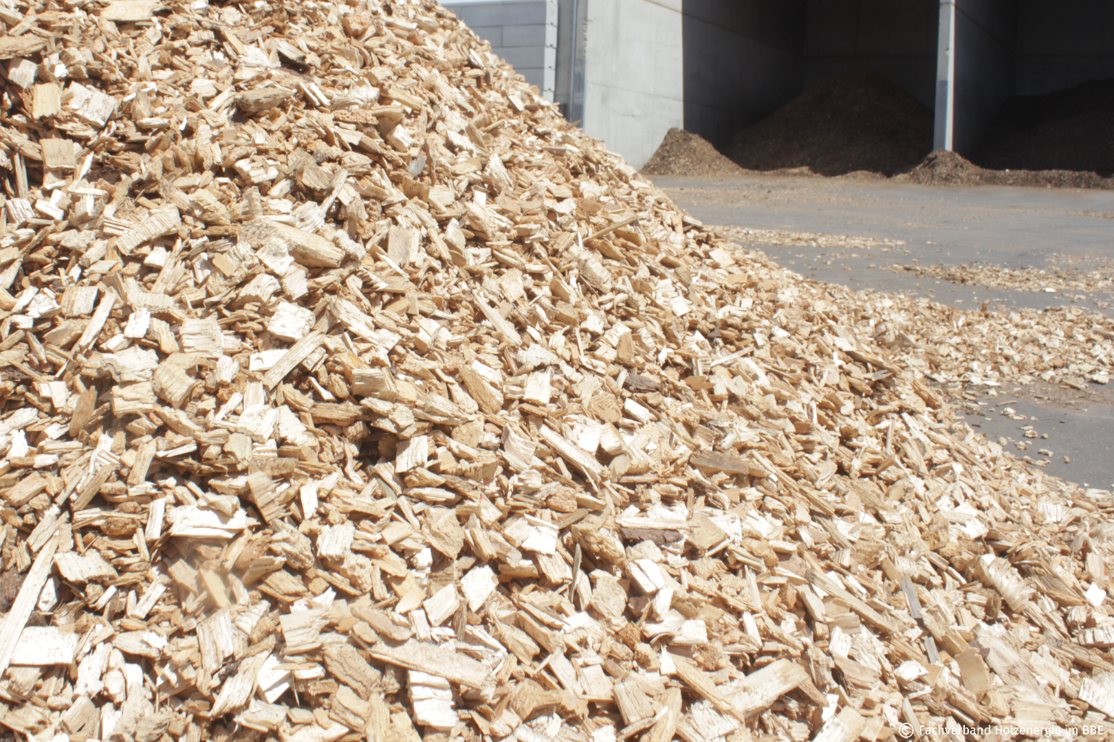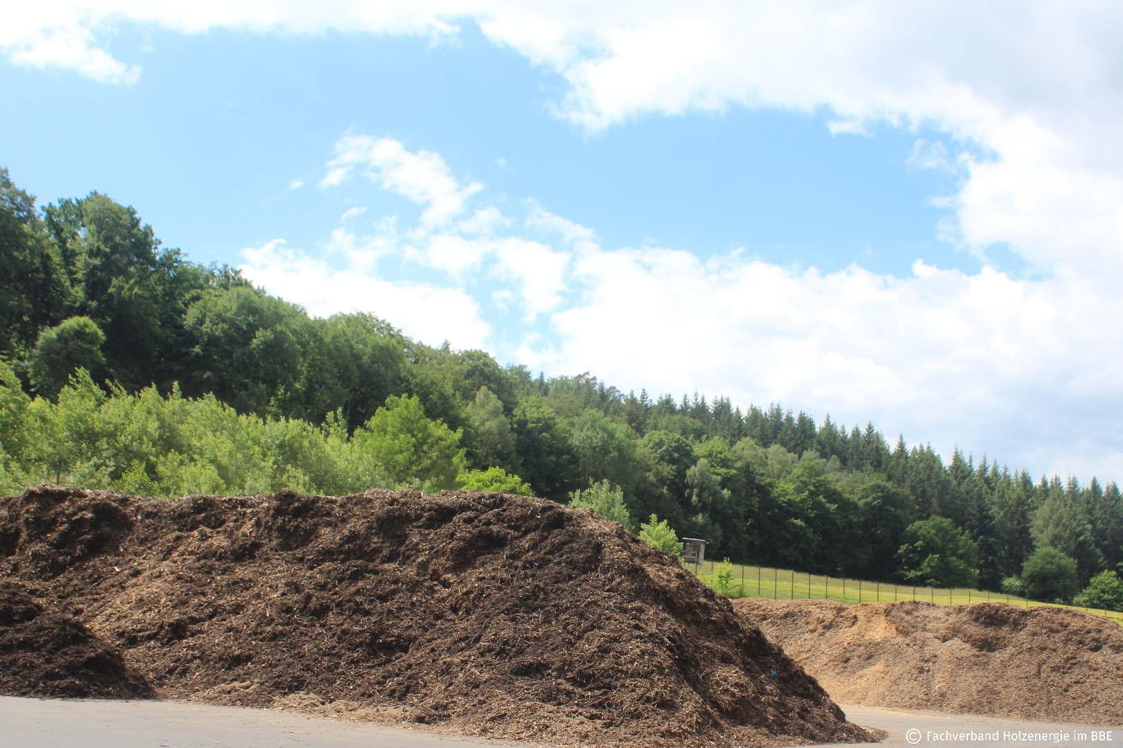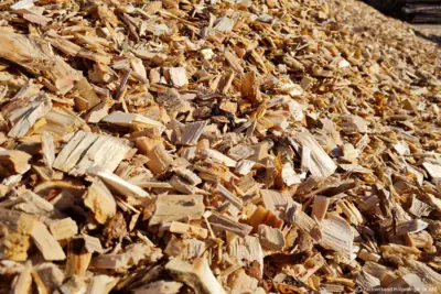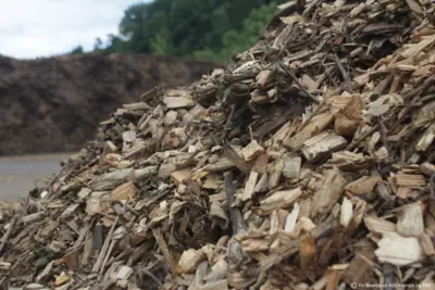 Hackschnitzel aus Landschaftspflegematerial mit Wald im Hintergrund