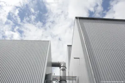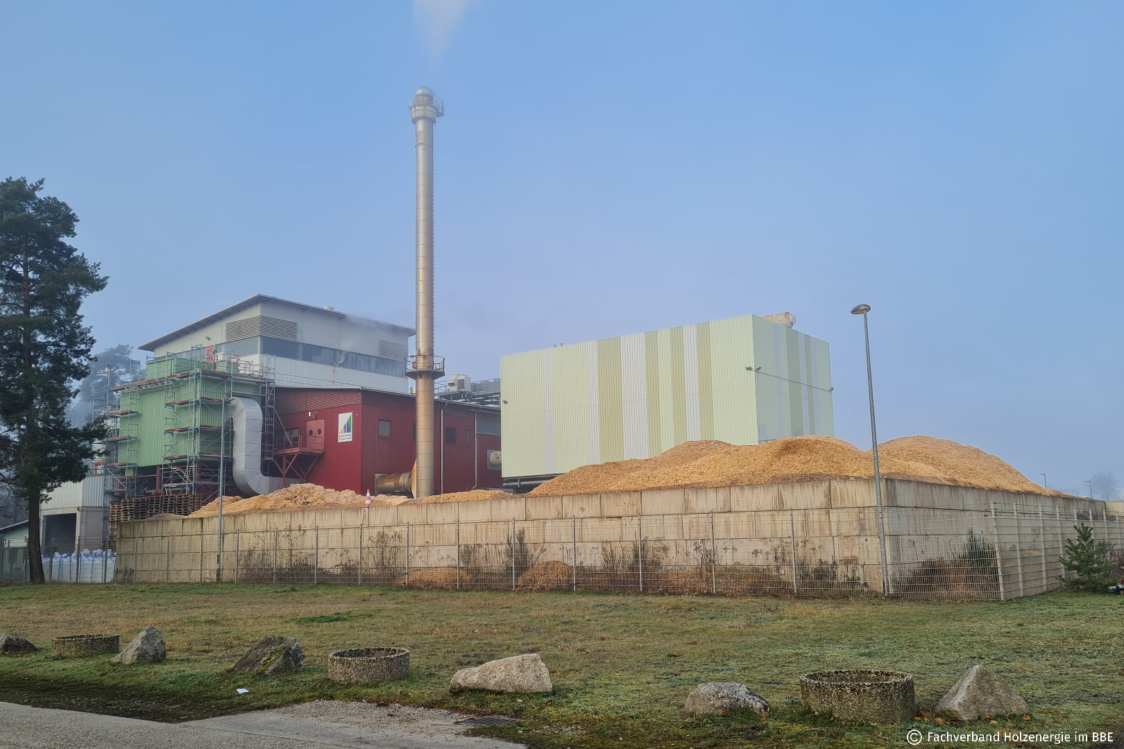 Außenansicht eines Biomasseheizkraftwerks mit Schornstein